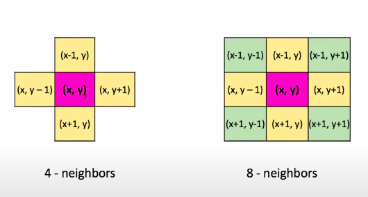 Có nhiều định nghĩa về lân cận của một điểm ảnh, hay dùng nhất là 4 - neighbors, 8 - neighbors như hình dưới.