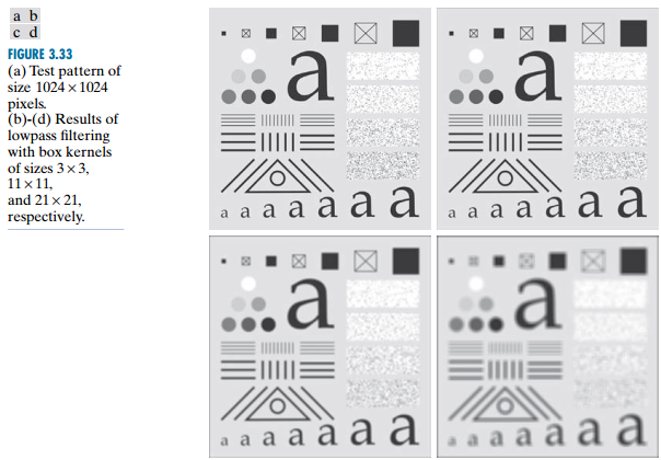 Box filter kernel thường được sử dụng để làm mịn các đường nét hoặc lọc nhiễu nhằm tăng cường chất lượng ảnh. Bên dưới là ví dụ khi ta áp dụng bức ảnh hình a với box filter có kích thước lần lượt là 3 x 3, 11 x 11, 21 x 21. Ta thấy càng tăng kích thước của kernel thì ta thấy ảnh mịn đi và mờ đi.