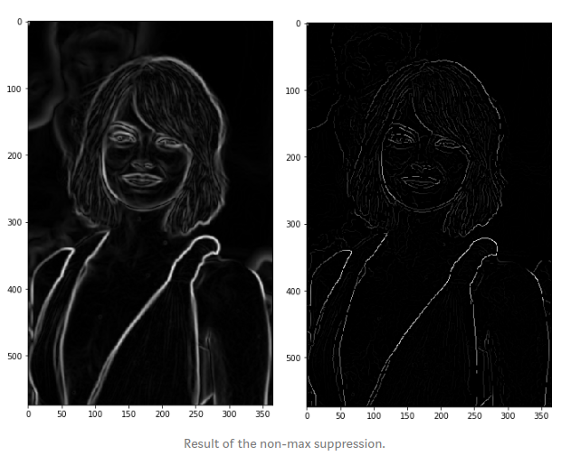 Non-maximum Suppression (viết tắt NMS): loại bỏ các pixel ở vị trí không phải cực đại toàn cục. Các điểm cạnh được định nghĩa là cực đại địa phương trogn ảnh độ lớn cạnh. Thuật toán để xác định điểm cạnh tại mỗi vị trí (x,y) được thực hiện như sau: