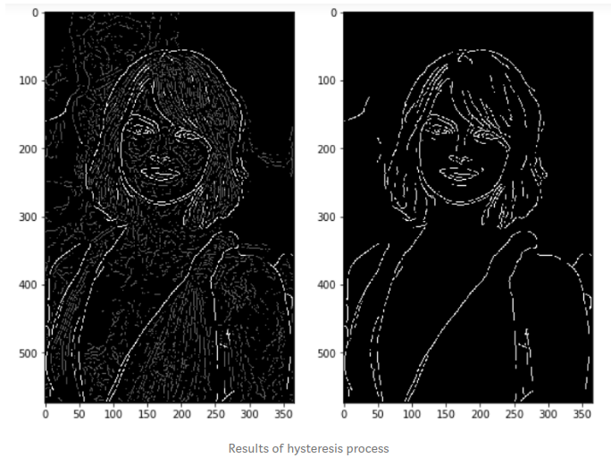 Cuối cùng: Các điểm được đánh dấu là cạnh mạnh được lựa chọn ngay là điểm cạnh. Những điểm cạnh yếu được chọn là điểm cạnh khi và chỉ khi nó nằm cạnh một điểm cạnh mạnh. Ở đây các điểm cạnh mạnh được coi là cạnh thực, những điểm cạnh yếu thì có thể là cạnh thực hoặc nhiễu. Và chúng chỉ có thể là cạnh thực nếu liền kề với một điểm là cạnh thực.
