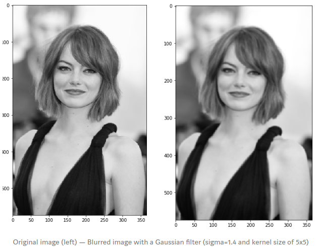 Giảm nhiễu: Ảnh thu nhận được từ thiết bị thu nhận thường có nhiều nhiễu, để nhiễu không ảnh hướng đến quá trình tách cạnh nó cần được giảm thiểu. Làm mờ ảnh, giảm nhiễu dùng bộ lọc Gaussian kích thước 5x5. Kích thước 5x5 thường hoạt động tốt cho giải thuật Canny. Dĩ nhiên bạn cũng có thể thay đổi kích thước của bộ lọc làm mờ cho phù hợp.