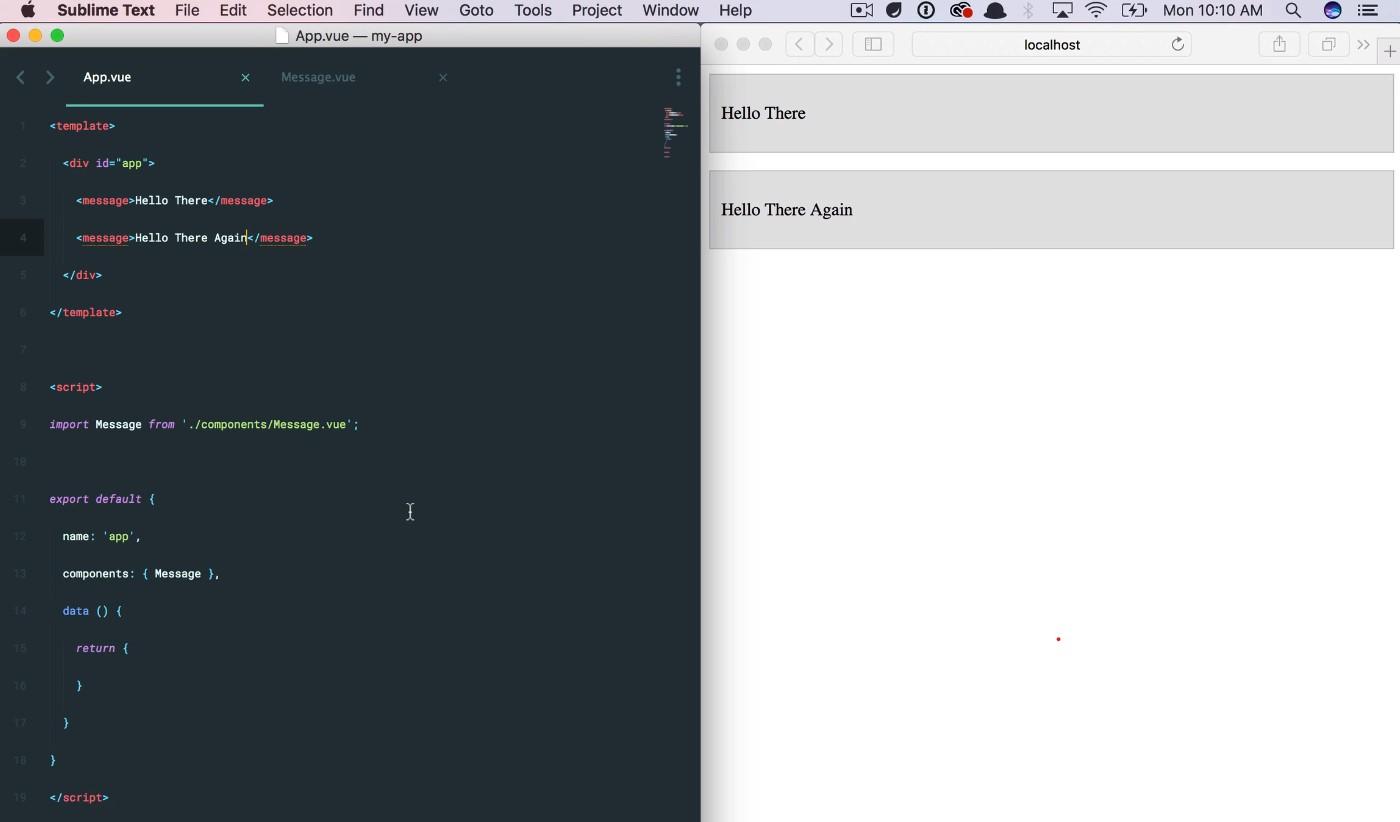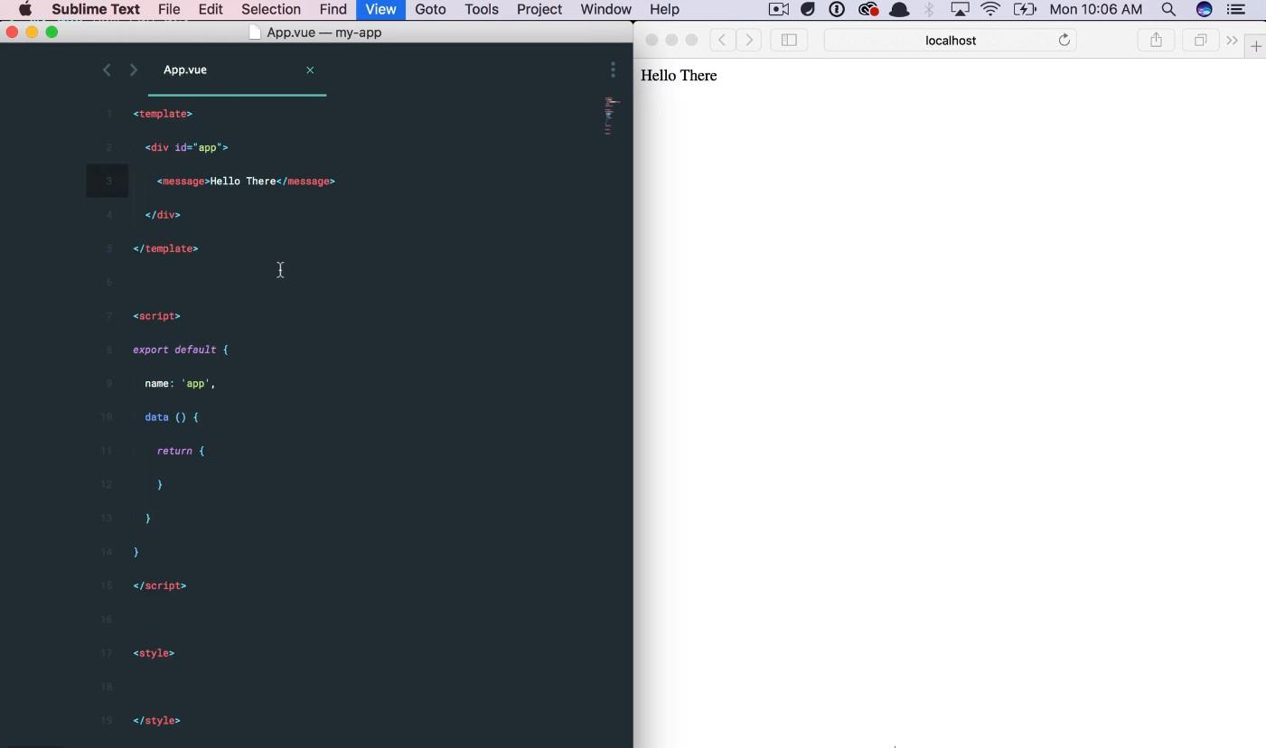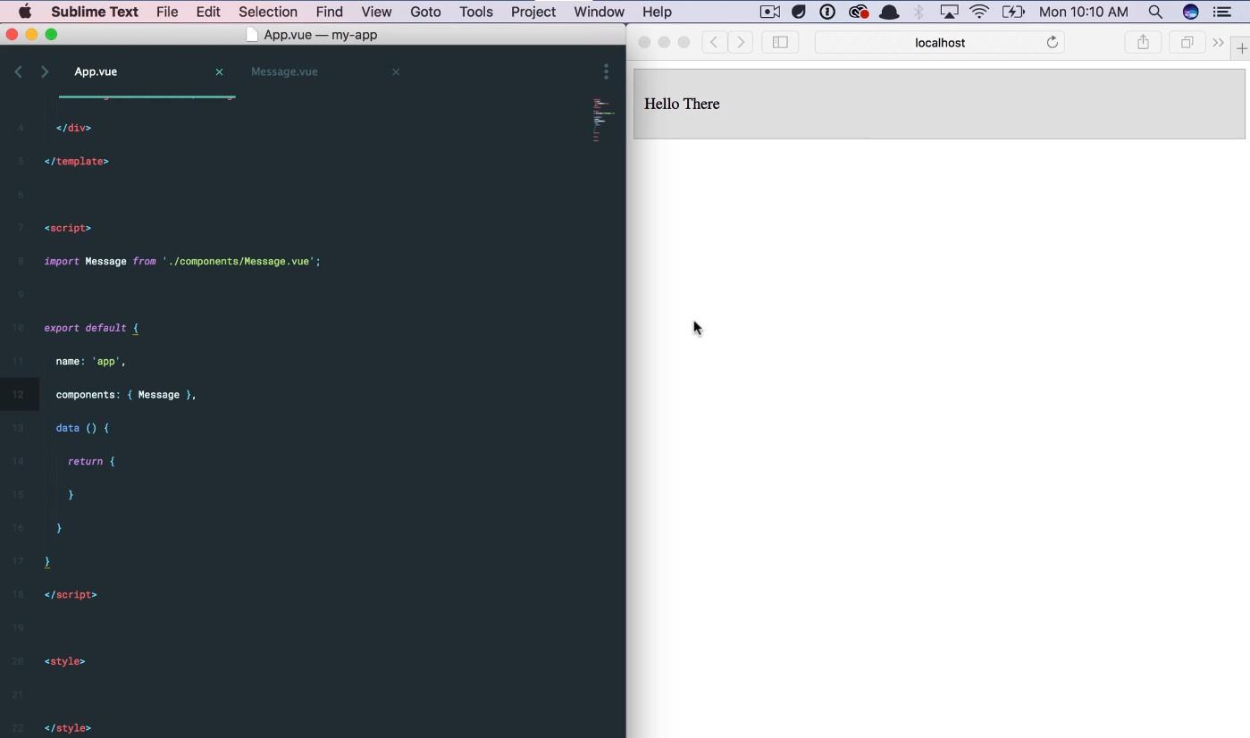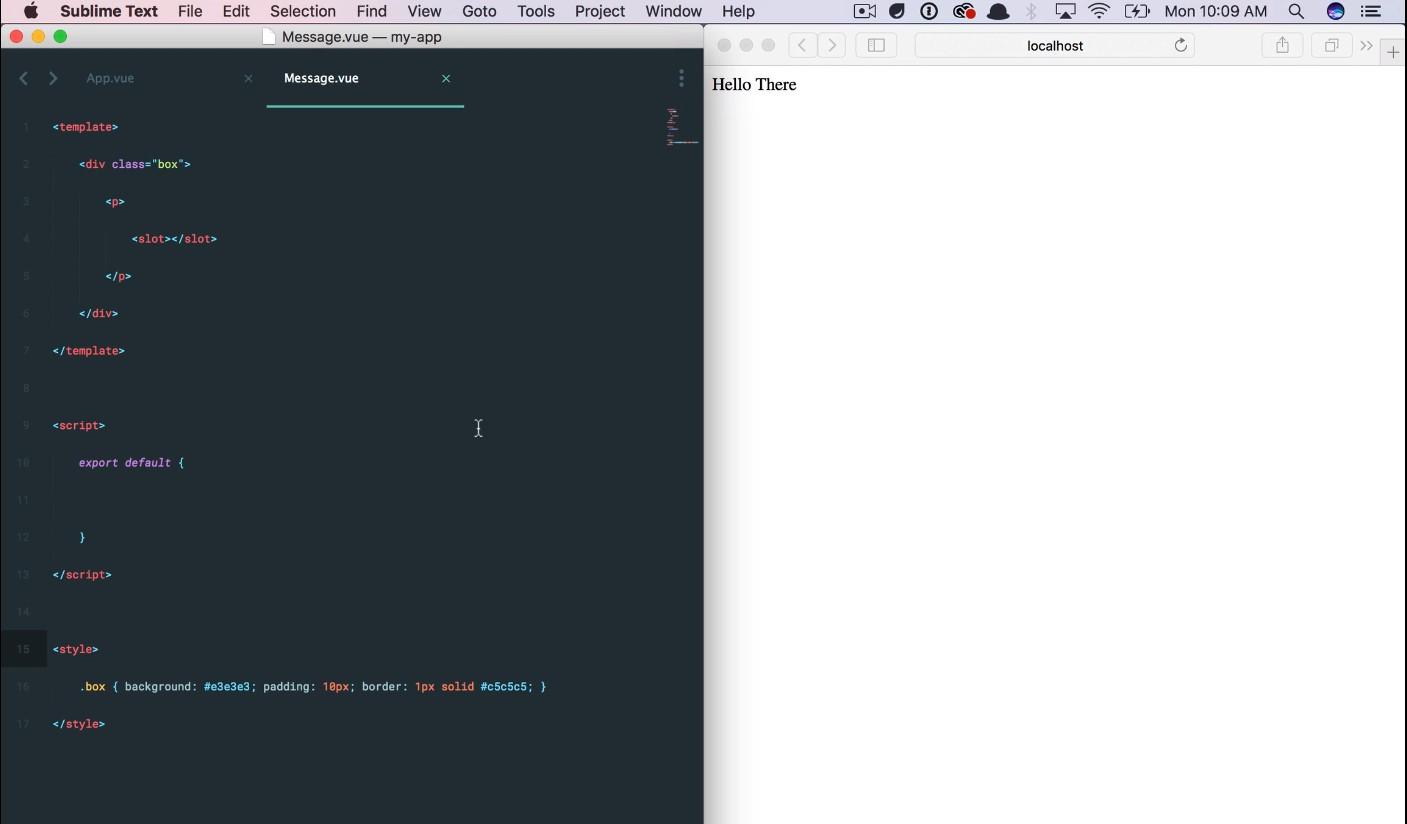 Quay lại file App.vue mình sẽ import file Message.vue vào, nhớ phải thêm cả components ở phần export nhé. Sau đó chúng ta sẽ có kết quả như bên phải ảnh. Style đã được nhận cho cặp thẻ <message></message>