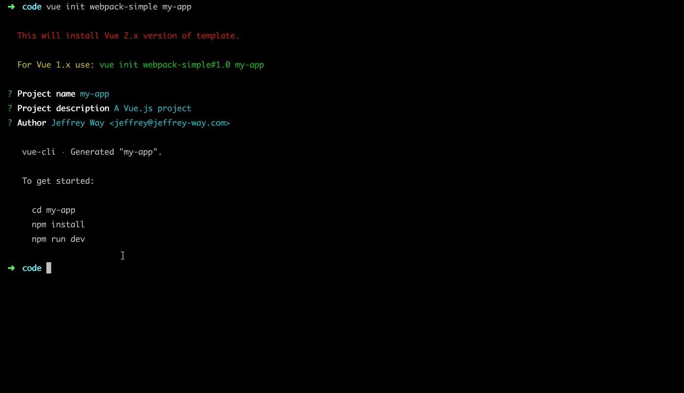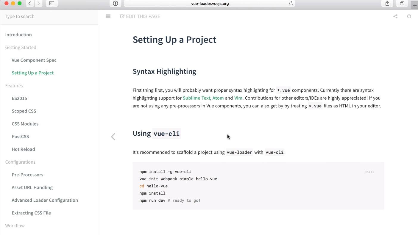Ở phần docs có hướng dẫn các command line để tạo được 1 project Vue có setting luôn web-pack.Sau khi chạy lần lượt các lệnh npm install -g vue-cli