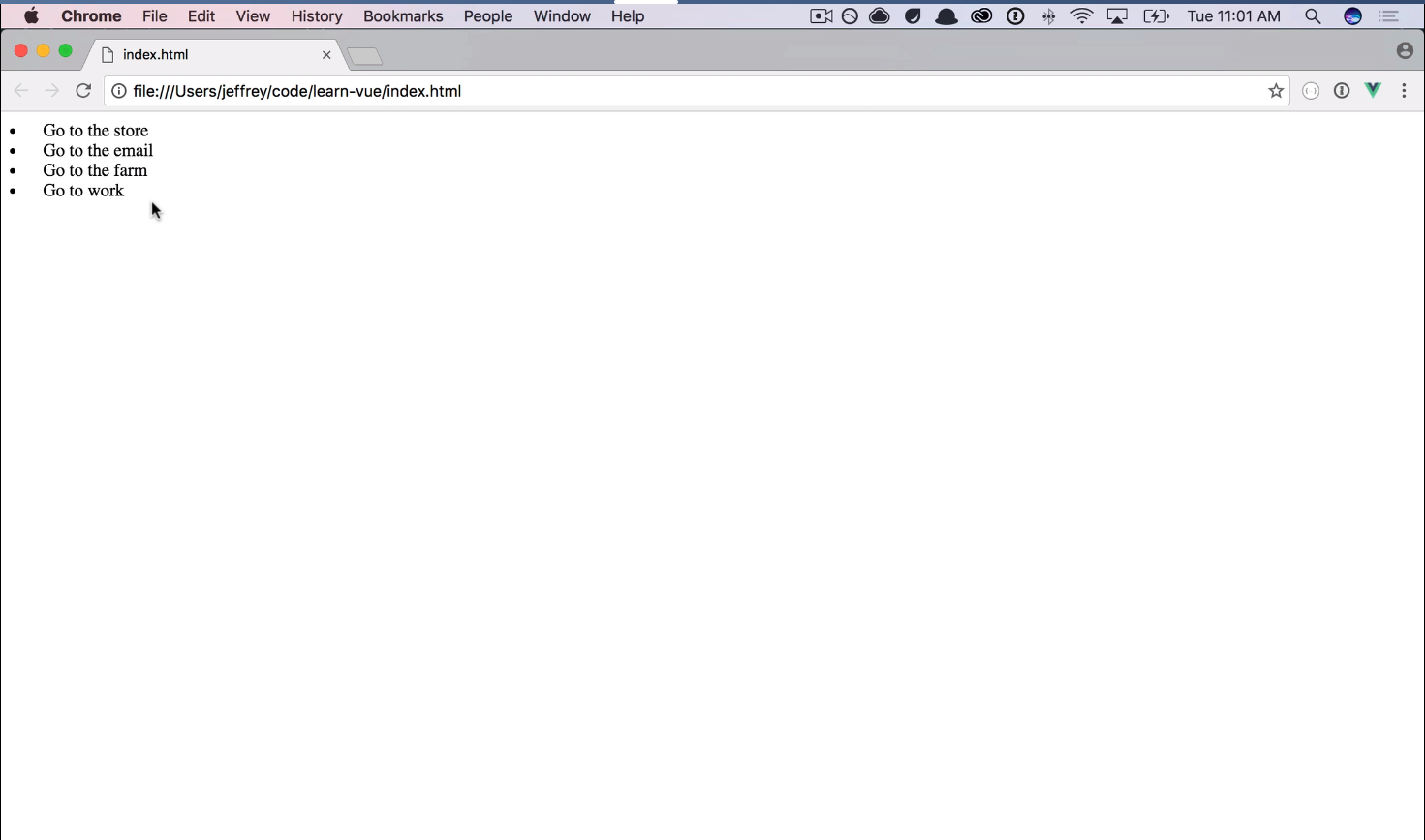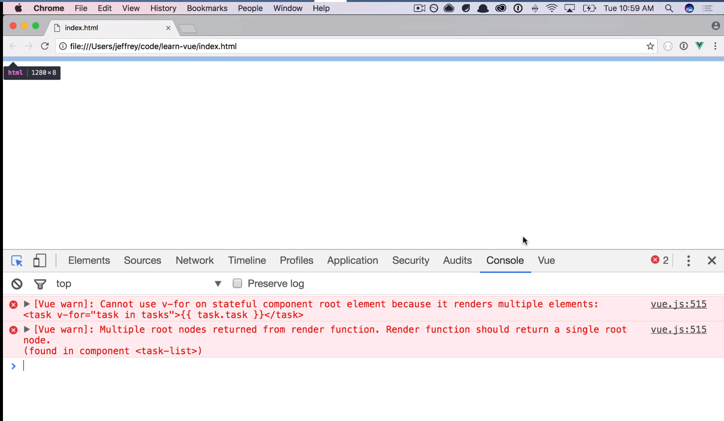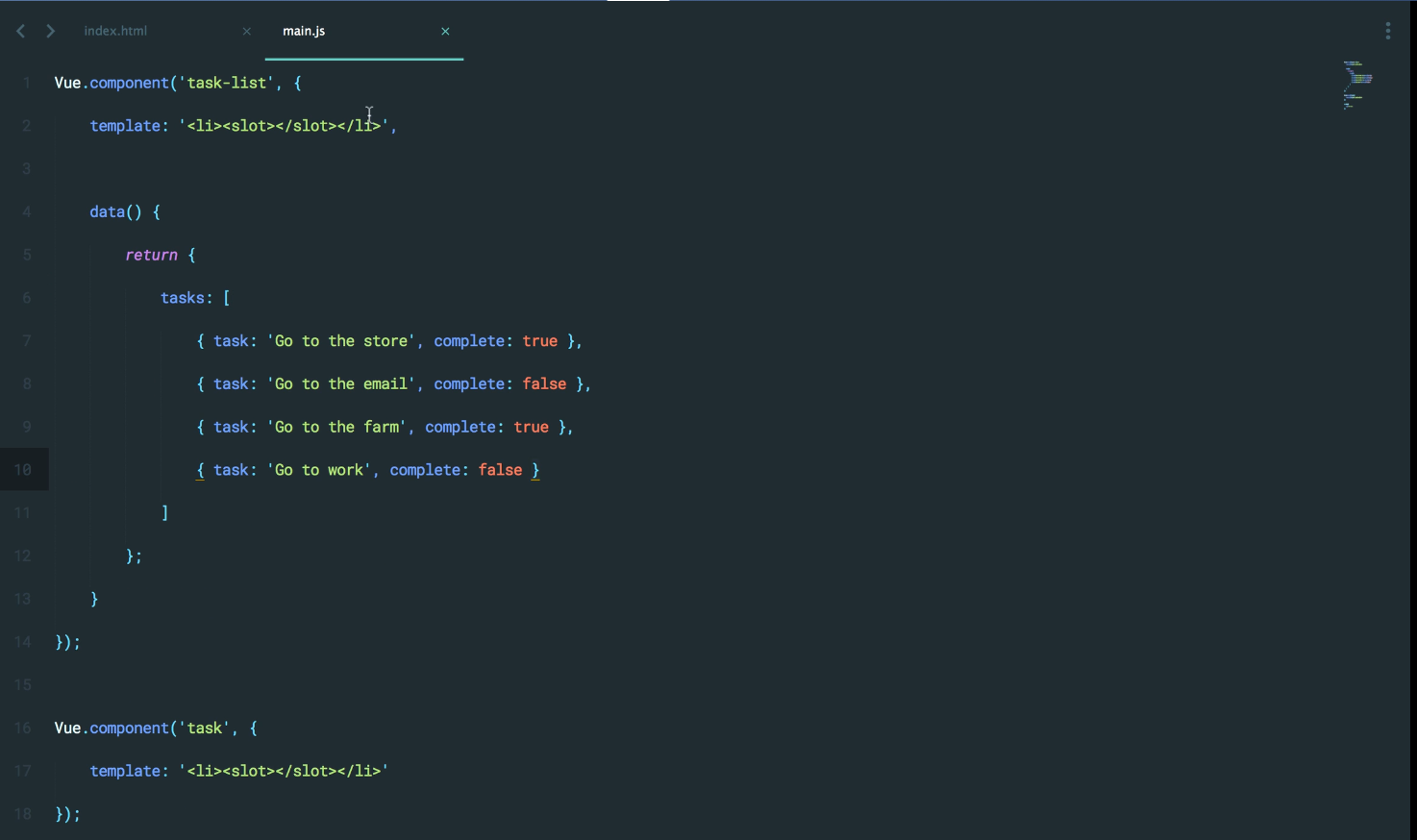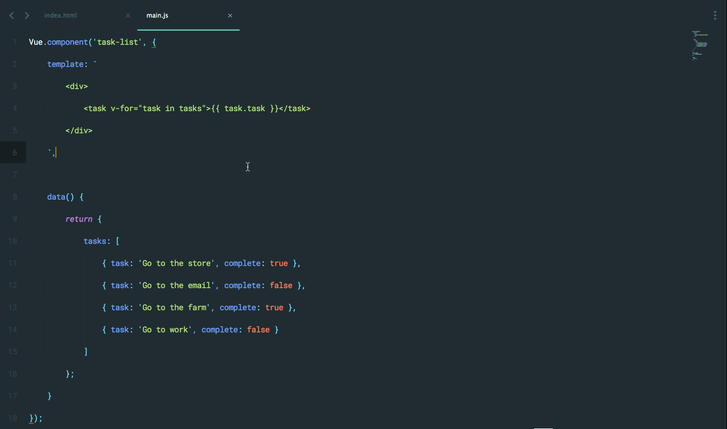 Hiện tại chúng ta đang dùng nhiều cặp thẻ <task> để hiển thị nhưng như thế thì trông lại không đẹp 1 chút nào, để trông code đẹp hơn cũng là nhanh tiện chúng ta sẽ thay đổi 1 chút. Đầu tiên ở file index.html chúng ta sẽ thay các thẻ task bằng 1 cặp thẻ task-list