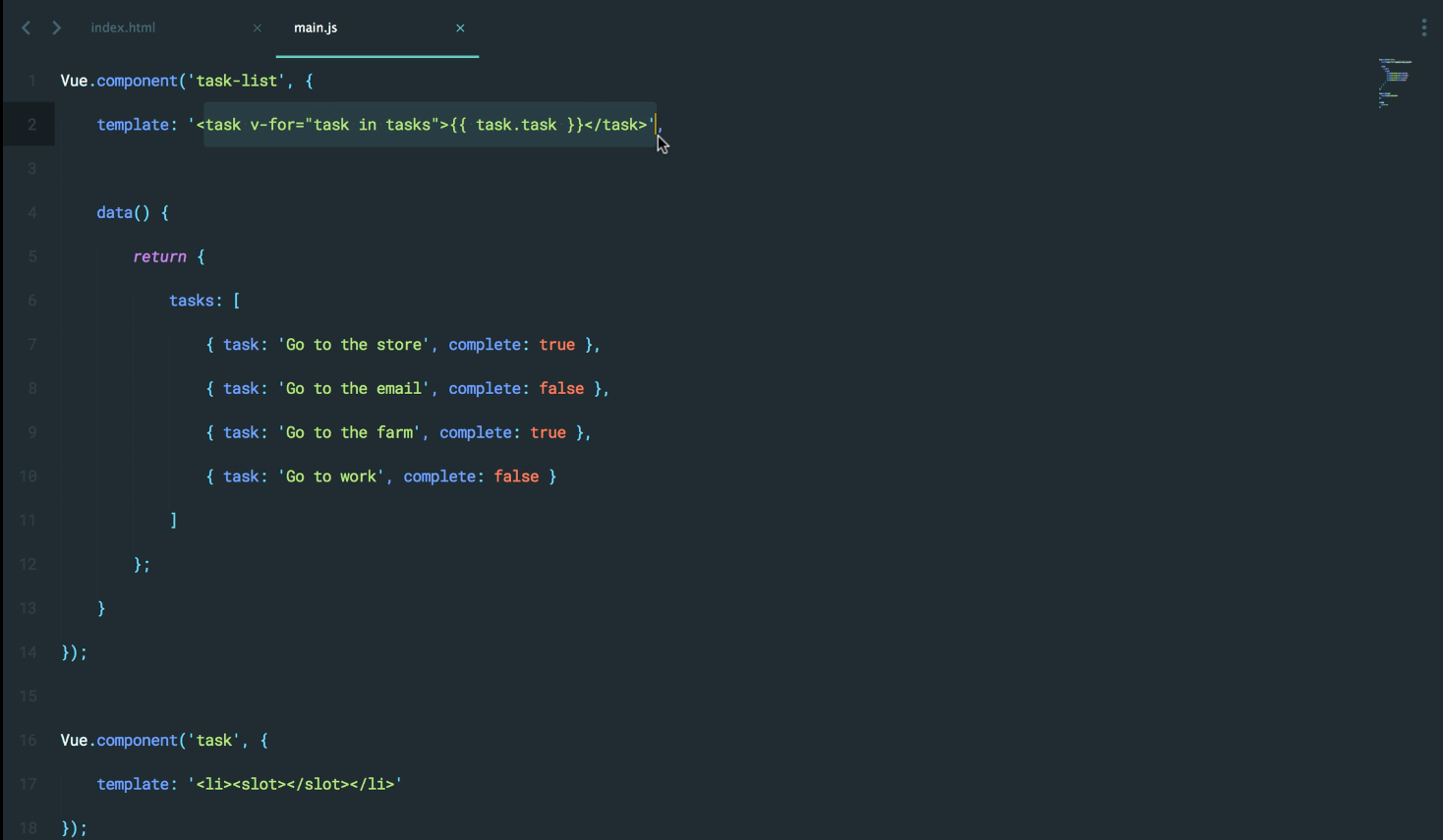 Còn ở file main.js chúng ta sẽ thêm vào 1 component task-list và data như sau.
