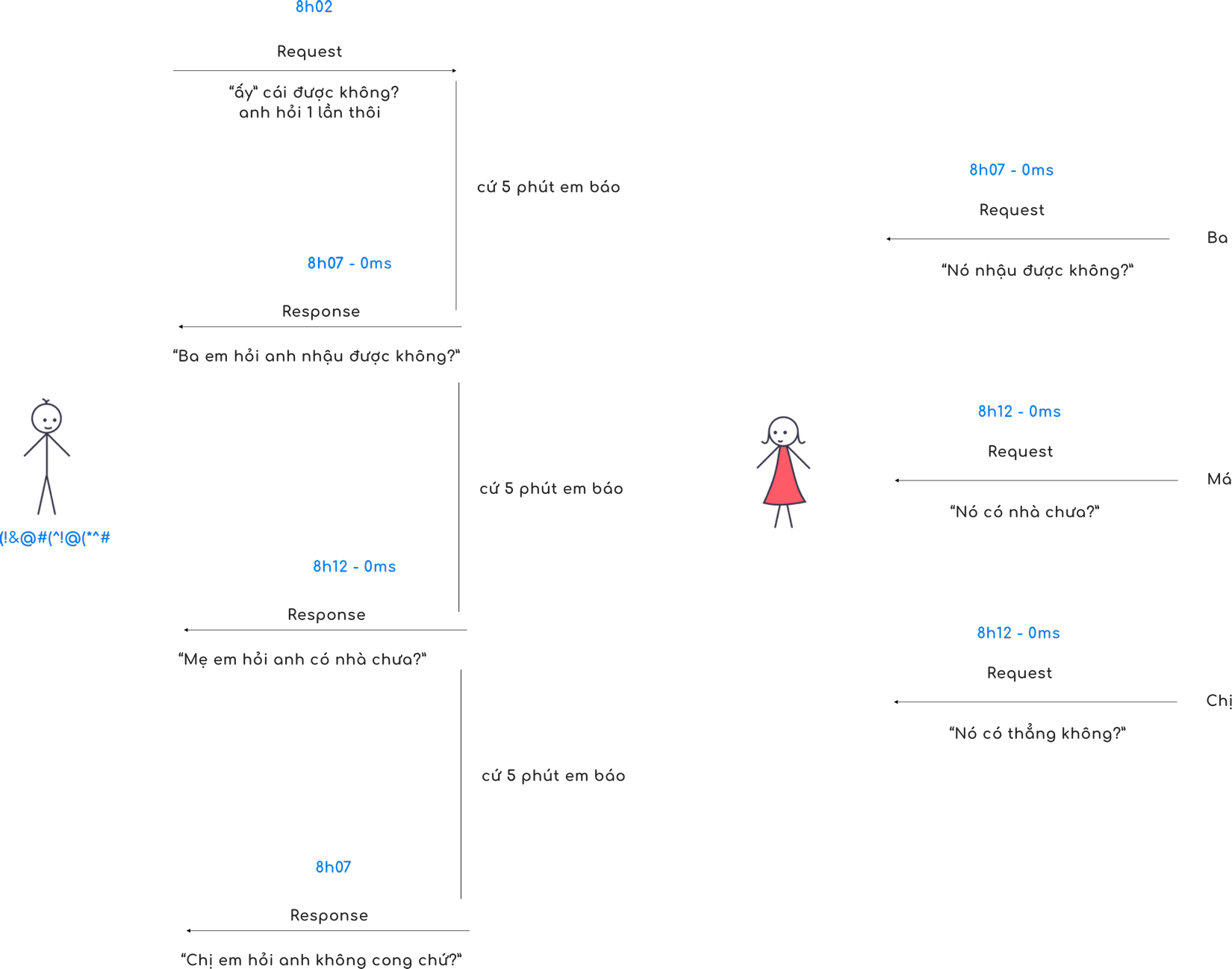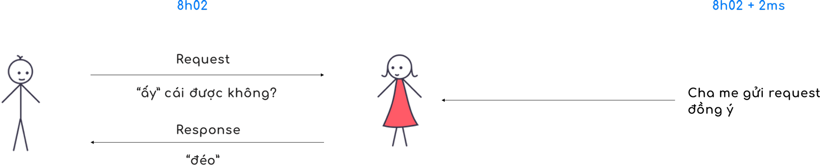 Vấn đề đối với kiểu truyền thống này là hai chữ lập tức. Thời nay đã hiện đại rồi, vừa mới 8h02 client (anh) gửi request cho em (server) thì sau 2 mi li se cần ba má server (em) gửi request với nội dung đồng ý.