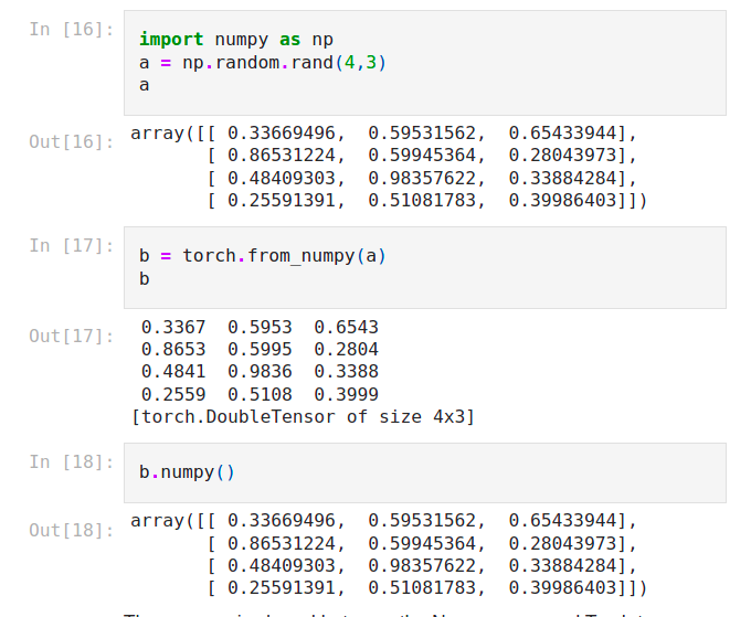 Bạn cũng có thể chuyển đổi từ kiểu dữ liệu Tensor sang mảng Numpy bằng hàm .numpy() và ngược lại chuyển từ kiểu numpy sang Tensor bằng hàm torch.from_numpy() như hình dưới: