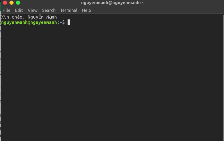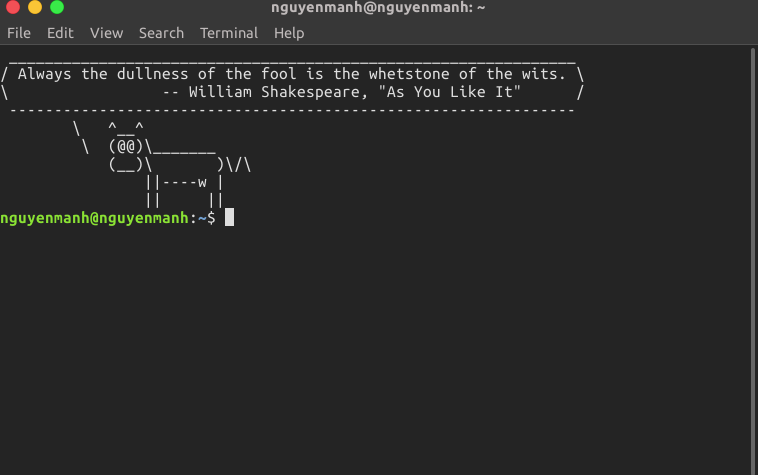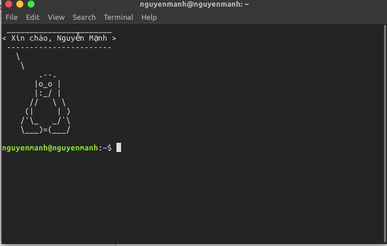 Chỉ cần thêm cowsay -f tux "Xin chào, Nguyễn Mạnh" vào cuối file ~/.bashrc là chúng ta lại có kết quả như vầy nè: