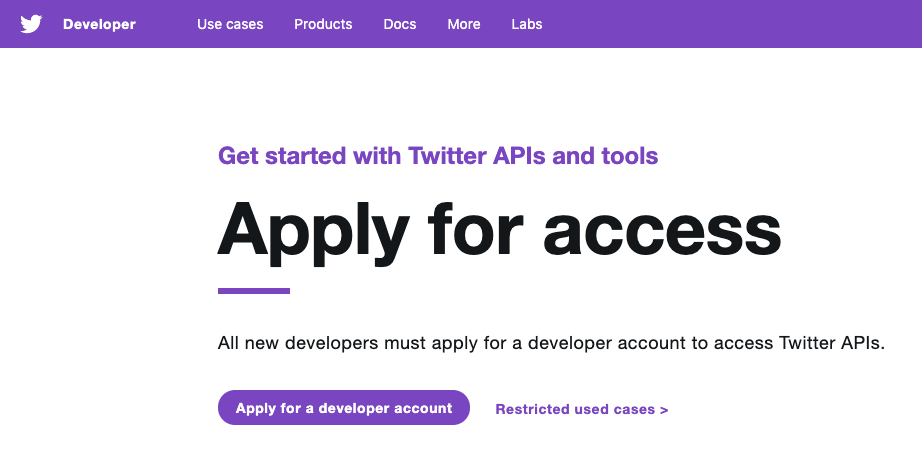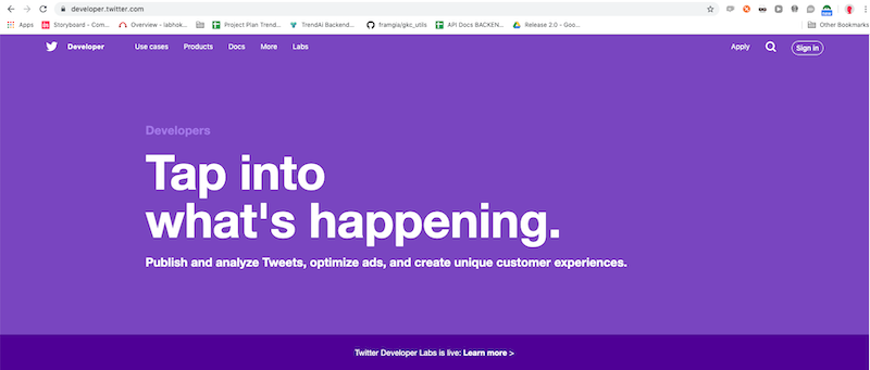 Để được sử dụng twitter api, giống như các social network khác là bạn sẽ phải đăng ký nhà phát triển với network đó, và xin các quyền cần thiết. Các bạn truy cập vào twitter developer và login với luôn account twitter của mình.