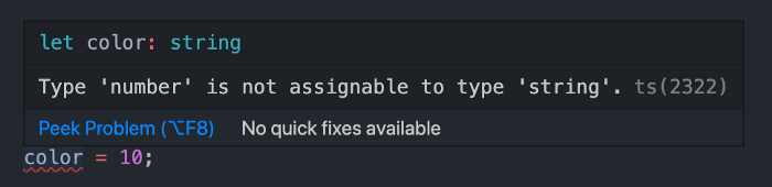 Để sửa điều này, chúng ta sẽ khai báo biến cùng với kiểu dữ liệu của nó. Bây giờ, Typescript sẽ biết được rằng giá trị của biến phải là 1 chuỗi, nếu chúng ta cố gắng gán một kiểu dữ liệu khác, nó sẽ hiển thị lỗi.