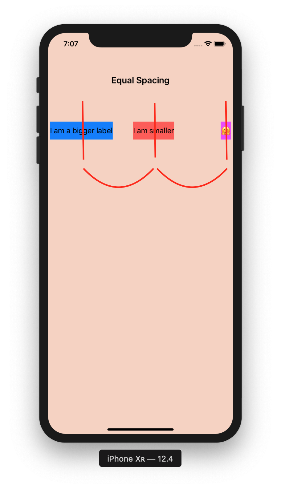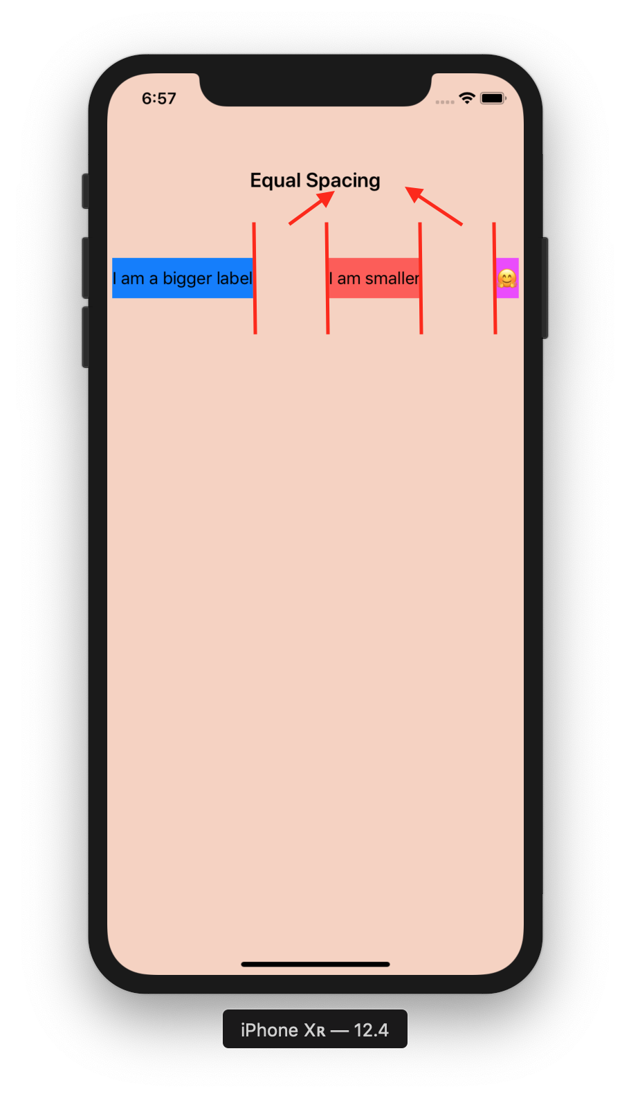 Equal Spacing sẽ duy trì khoảng cách bằng nhau giữa mỗi subview và sẽ không thay đổi kích thước các subview. Mình sẽ minh họa điều này bằng cách vẽ các đường màu đỏ để chỉ ra kích thước bằng nhau của khoảng cách giữa các label.