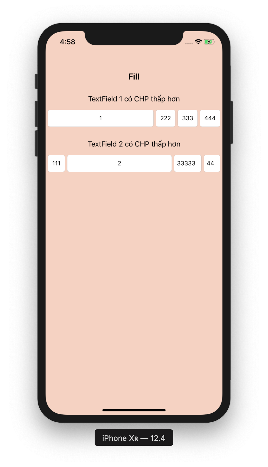 Đây là type distribution mặc định khi bạn tạo một UIStackView mới. Trong ví dụ, mình có 2 UIStackView, dùng subview là các UITextField bên trong horizontal UIStackView. 1 subview có CHP (Content Hugging Priority) thấp hơn sẽ tự fill rộng ra bằng với khoảng trống còn thừa của các subview còn lại.