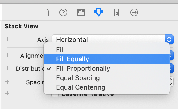 Thuộc tính distribution để chỉ định các subview được layout như thế nào trong stack. Bạn có thể tìm chỗ setting ở Interface Builder như sau (hoặc setting trong code):