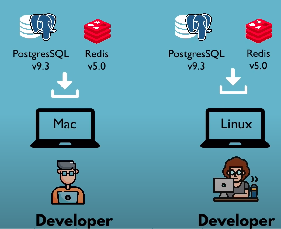 👍So now let's see how containers solve some of these problems with containers. With containers, you actually do not have to install any of the services directly on your operating system. Because the container is own isolated operating system layer with Linux based image. So you have the PostgresSQL, pakage with a configuration in the start script inside of one container. And the download step is just one docker command which fetches the container and starts it at the same time. So we have 10 applications that your Javascript application uses and depends on, you would just have to run 10 docker commands for each container and that will be it. Which makes the setting up your local development enviroment actually much easier and much more efficient than the previous version.Also, you can actually have different versions of the same application running on your local environment without having any conflict.