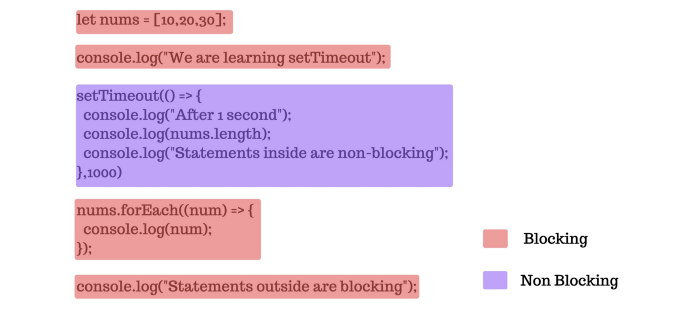 setTimeout() non-blocking có nghĩa là nó sẽ chạy khi các câu lệnh bên ngoài nó được thực thi và sau đó một giây nó sẽ thực thi. Tất cả các câu lệnh khác không phải là một phần của setTimeout () là blocking, có nghĩa là không có câu lệnh nào khác sẽ thực thi trước khi câu lệnh hiện tại kết thúc.