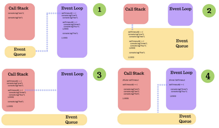 SetTimeouts đầu tiên, thứ hai, thứ ba và thứ tư được thực thi tuần tự khi chúng ra khỏi vòng lặp sự kiện vào ngăn xếp cuộc gọi.
