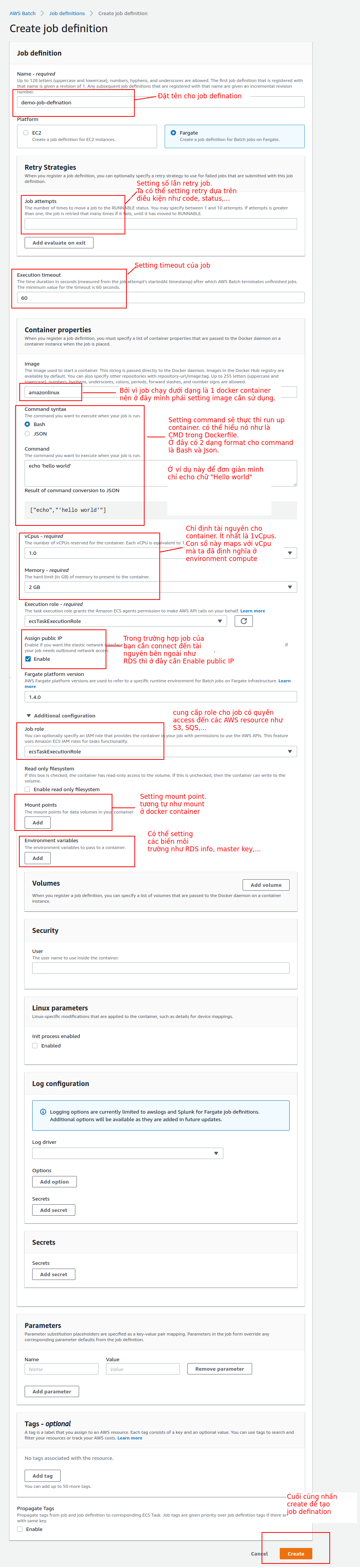 - Job defination: Dùng để định nghĩa các thứ liên quan đến job như chiến lực retry(khi nào thì retry, ví dụ status code 400), thời gian timeout của job. Các định nghĩa về container như image, role(aws role như role upload ảnh lên S3,...).