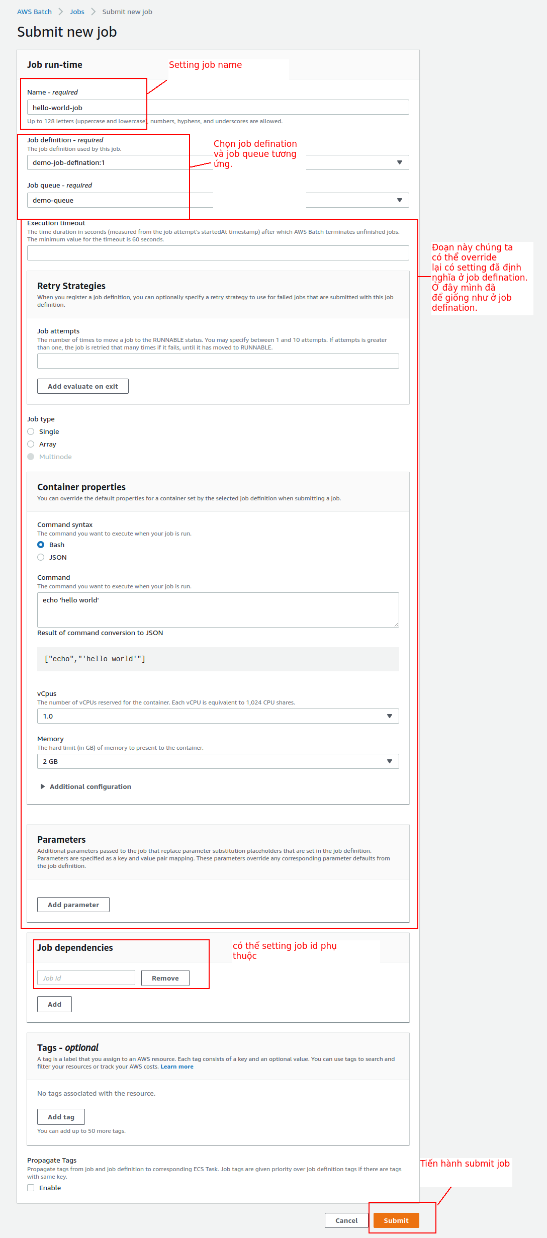 - Job: Job là một đơn vị công việc(như thực hiện một script, thực hiện 1 lệnh linux,..) mà ta đã submit cho AWS Batch. Job đều có tên và chạy giống dưới dạng là một docker container trên AWS Farage hoặc EC2 resources. Ta có thể config các job phụ thuộc lẫn nhau.