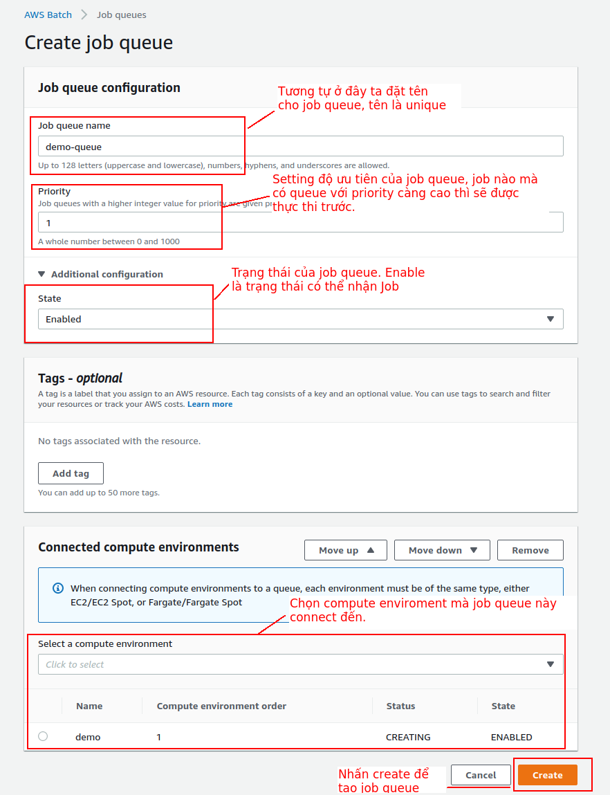- Compute environment: Dùng để định nghĩa các thứ liên quan đến tài nguyên máy tính mà job sử dụng để thực hiện như sử dụng Farage hay EC2 resource, On-demain hay loại Spot, dụng lượng bộ nhớ bao nhiêu. Các cài đặt về network như VPC, security group. Hình dung đơn giản là bạn chọn tài nguyên kiểu gì(tài nguyên ở đây nôm na như 1 cái máy tính) để đặt job vào đó chạy
