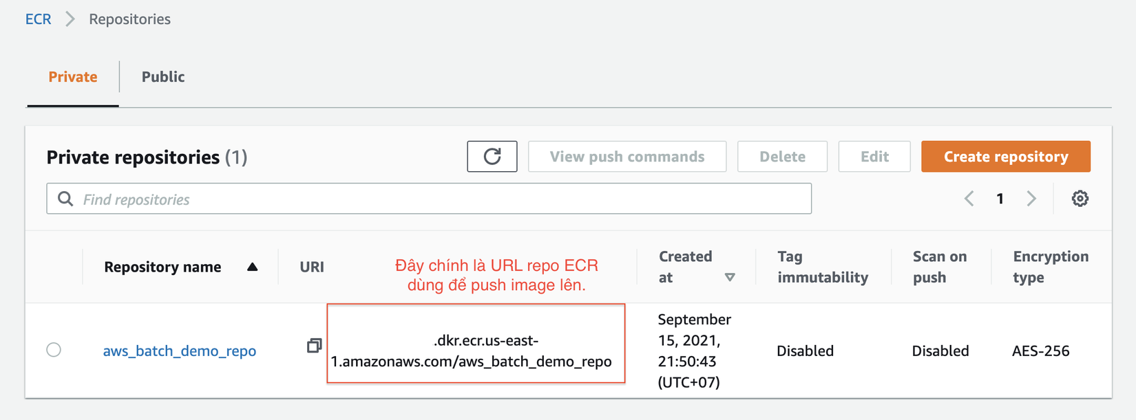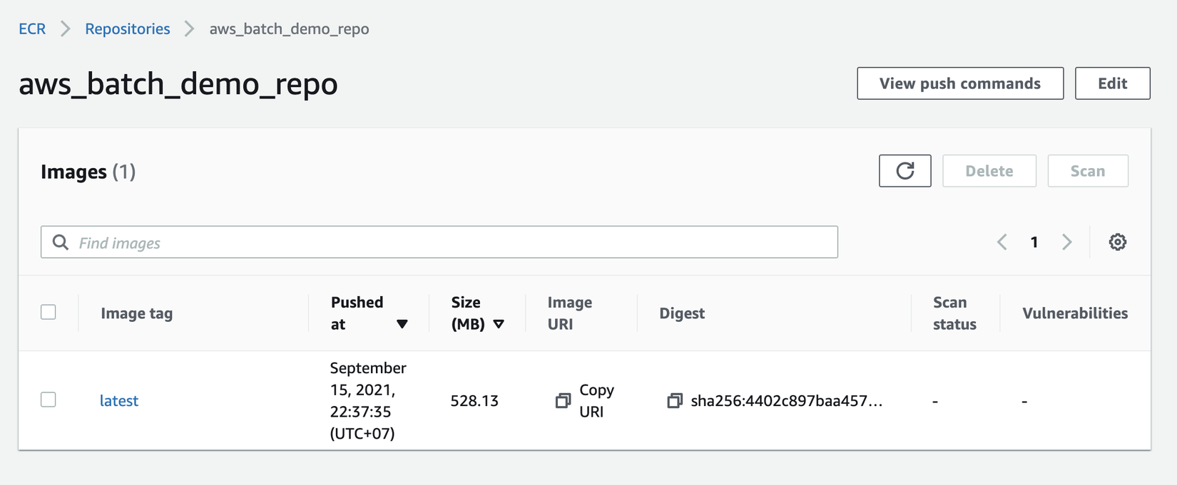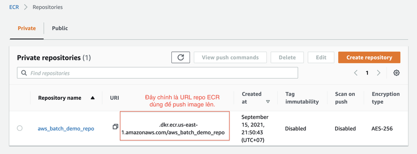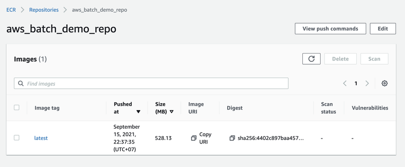 docker push 12345679.dkr.ecr.us-east-1.amazonaws.com/aws_batch_demo_repo- Sau khi push done thì ta sẽ thấy trong repo có bản latest