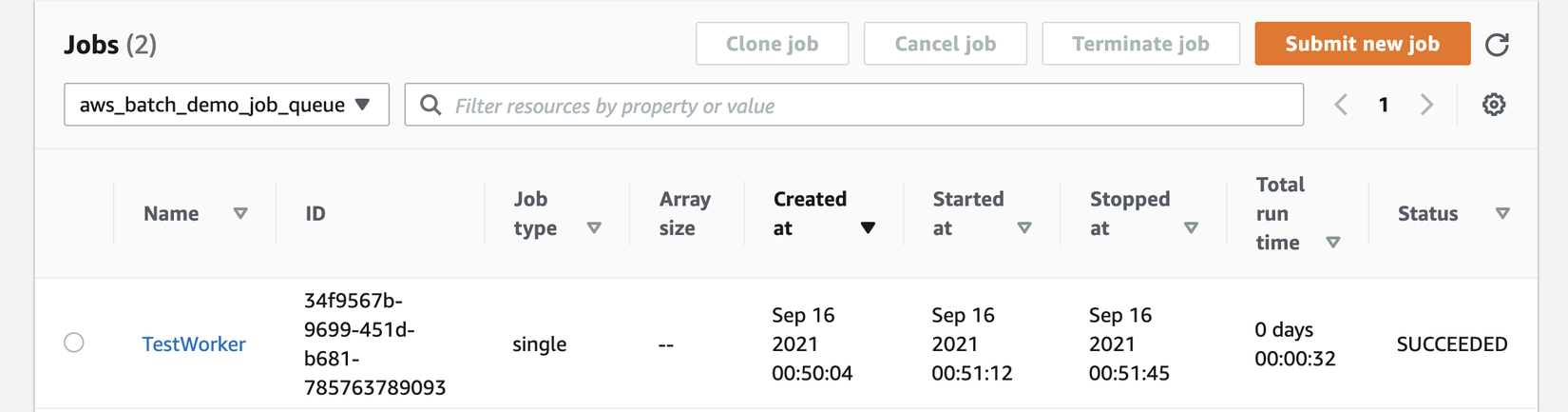 => #<struct Aws::Batch::Types::SubmitJobResponse job_arn="arn:aws:batch:us-east-1:123456789:job/08d856df-da7b-4349-8038-a9d763e6d483", job_name="TestWorker", job_id="08d856df-da7b-4349-8038-a9d763e6d483">