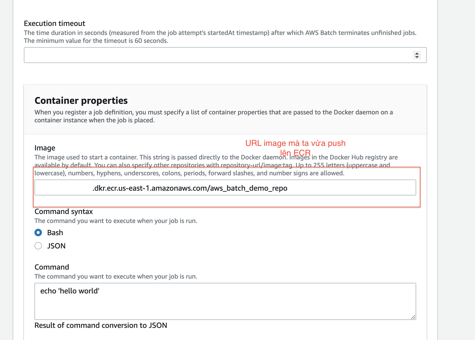 Job defination lần này tương tự job defination ở phần 1. Mình chỉ thay image thành image ta vừa PUSH lên ECR là dk.