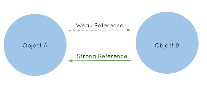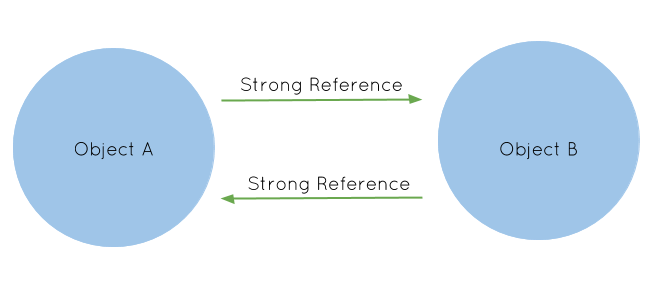 Trong hình, chúng ta sẽ thấy 2 object A và B và chúng được trỏ reference với nhau. Vậy sẽ có chuyện gì xãy ra nếu chúng ta release toàn bộ 2 object này? Đó là reference count của 2 object này chắc chắc sẽ luôn tồn tại ít nhất là 1 do đó hệ thống sẽ không thể xoá chúng mà chúng vẫn mãi được giữ trong bộ nhớ. Nhỡ nó là một cái gì đó khá là nặng cho bộ nhớ thì sao: như controller với rất nhiều components UI và dữ liệu nội bộ. Ở một góc nào đó, bạn sẽ đượn ôn lằn với một cú crash thần thánh vì iOS giới hạn bộ nhớ khả dụng cho ứng dựng tuỳ thuộc vào hệ điều hành và thiết bị.