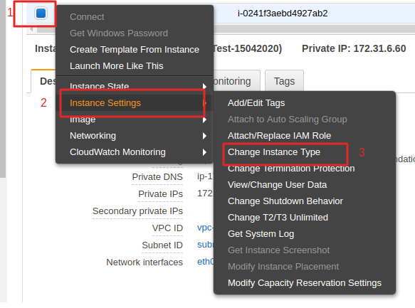 Chọn Chon instance mà bạn muốn nâng cấp RAM > Chon Instance setting > Change Instance Type