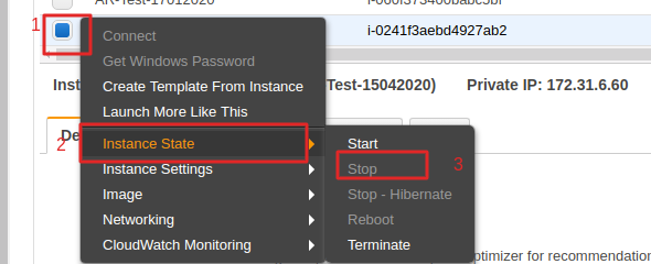 Chọn Chon instance mà bạn muốn nâng cấp RAM > Chon Instance state > Stop