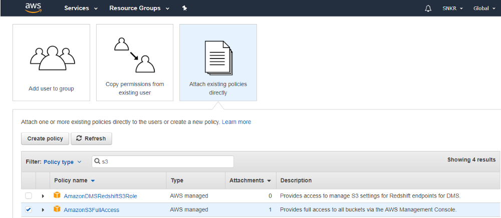 Bạn phải thêm quyền cho user vừa tạo. Nhấn 'Attach existing policy directly', Trên ô tìm kiếm nhập 's3' trong tất cả các kết quả được tìm kiếm chọn AmazonS3FullAccess