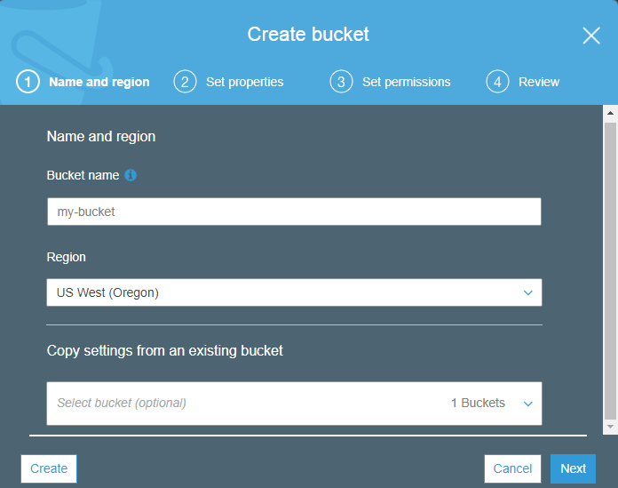 Nhập tên bucket (Tên bucket là unique) và chọn khu vực gần bạn nhất. Nhấn button Create
