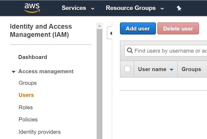Bây giờ hãy tạo user . Chọn Services -> IAM. Trên khung điều hướng bên trái chọn User sau đó chọn Add user.