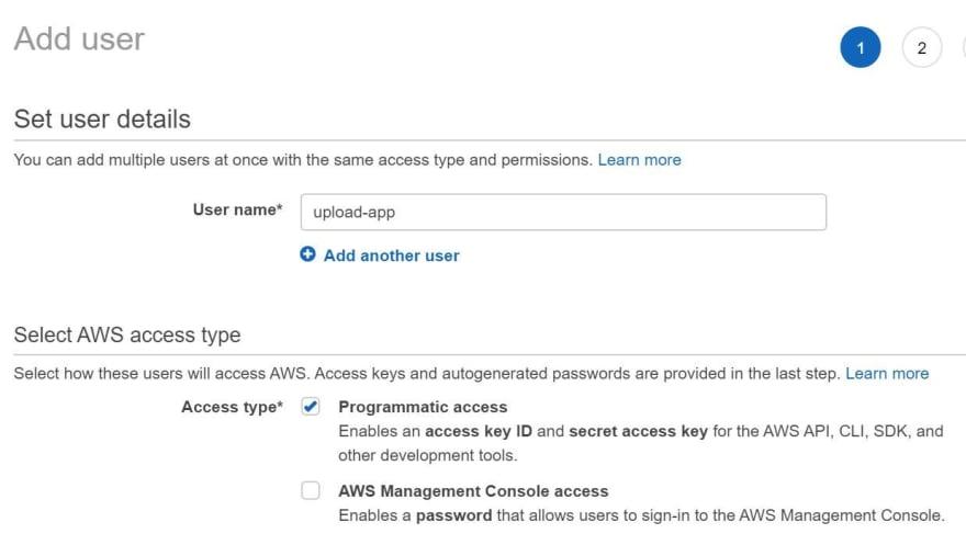 Nhập user name và tích vào check box Accesss type 'Programmatic access'. Nhấn button next.