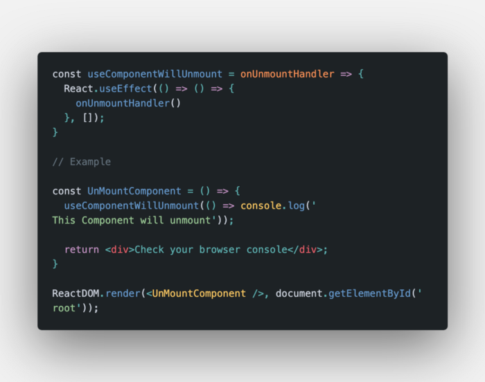 useComponentWillUnmount tương tự như ví dụ trên nhưng sẽ thực hiện callback ngay sau khi component được unmounted. Vì vậy, chúng ta sử dụng lại useEffect với một array trống làm đối số thứ hai để thực hiện callback đã cung cấp ngay trước khi dọn dẹp.