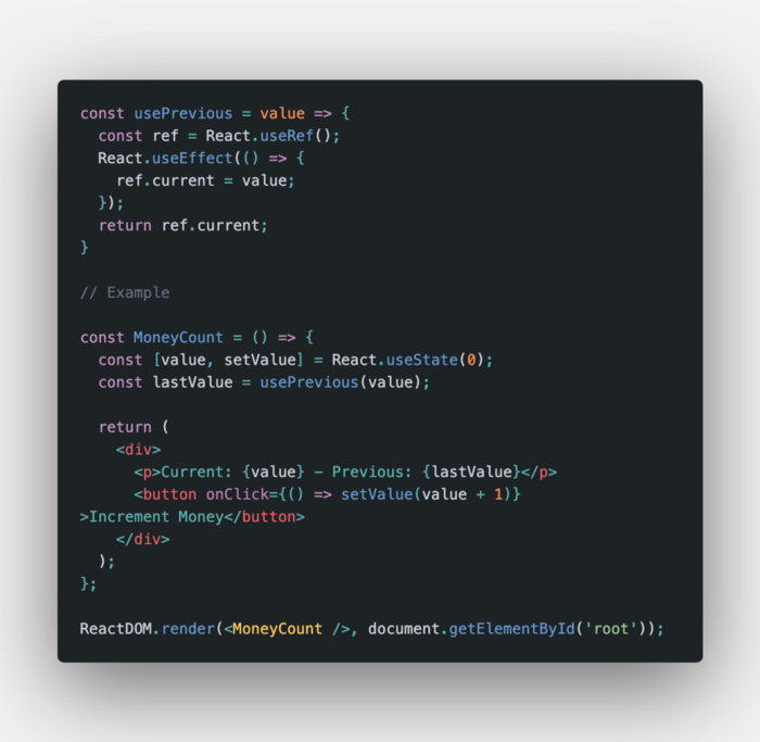 Đây là một custom hook tuyệt vời khác mà chúng ta có thể sử dụng trong các ứng dụng của mình. Với nó, chúng ta có thể lưu trữ các props hoặc states trước đó.