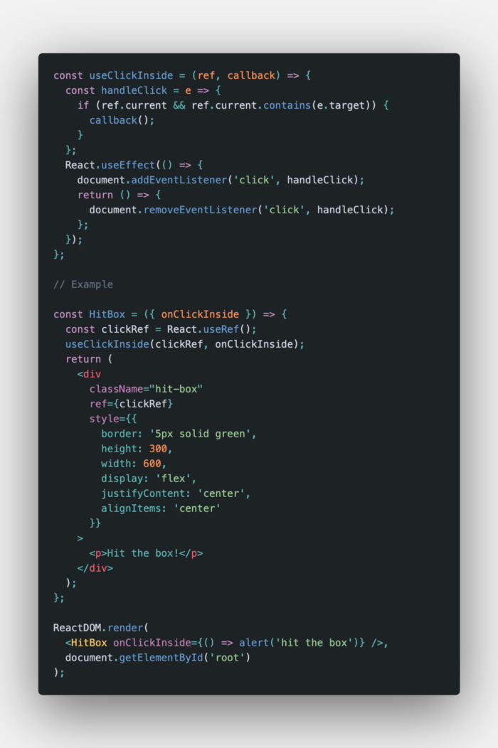 - Cuối cùng, chúng ta sử dụng useRef để tạo tham chiếu cho component được click và chuyển nó vào useClickInside hook.