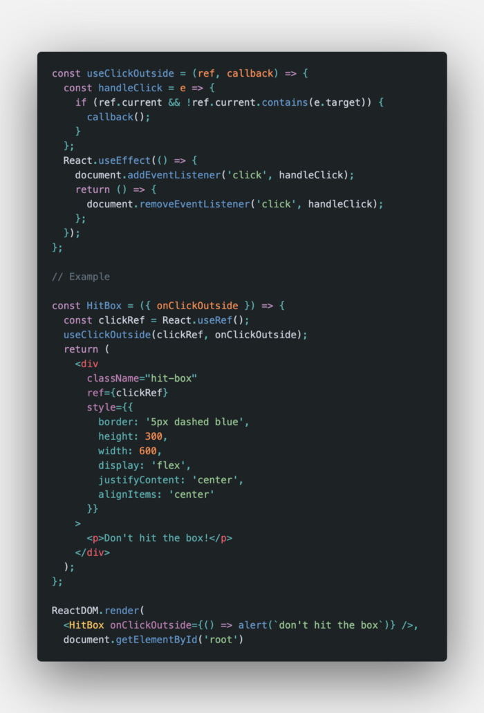 useClickOutside hook khá giống với useClickInside hook nhưng nó thực hiện việc click bên ngoài một component được bọc chứ không phải bên trong. Vì vậy, một lần nữa, chúng ta
