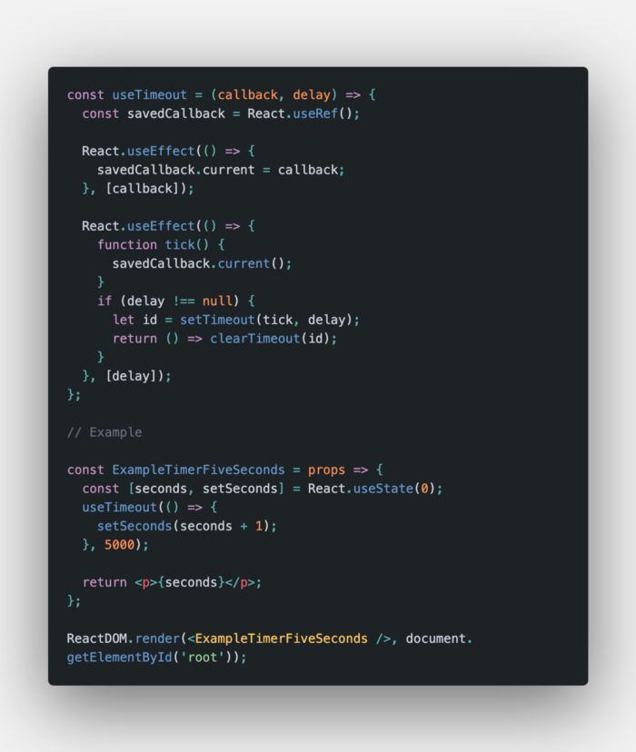 Với hook này, chúng ta có thể implement setTimeout bằng cách sử dụng phương pháp khai báo.