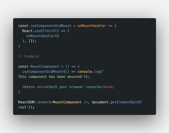 Hook này là một ví dụ nhỏ về cách thực hiện callback ngay sau khi một component được mounted. Đối với đối số thứ hai, chúng ta chỉ cần sử dụng useEffect với một array trống để thực hiện callback được cung cấp ngay khi component được gắn.