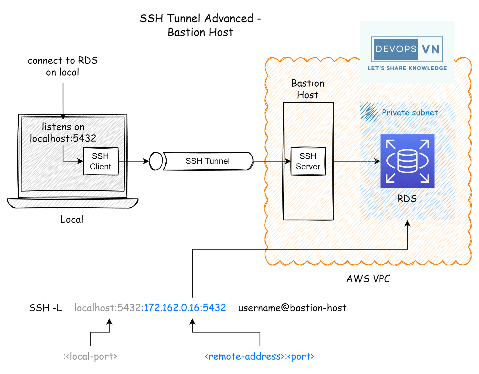 We will encounter this case the most when we use the Cloud, for example with AWS we will create Amazon Relational Database Service (RDS) in a private network, of course, because the network is closed, we will not be able to connect to it. RDS from the outside, the common way people use it is to create a Bastion Host, and we will connect to RDS through this bastion host.