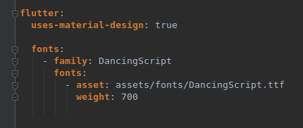Bước này bạn cần khai báo font trong file pubspec.yaml để Flutter có thể hiểu được bạn sẽ dùng font này. Cú pháp như sau: