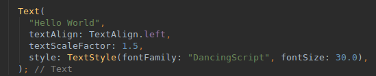 Nếu bạn chỉ muốn áp dụng font cho 1 widget nào đó, mà không phải cho toàn bộ app, ví dụ cho Text chẳng hạn. Bạn cần thiết lập TextStyle cho nó, trong đó bạn khai báo thuộc tính fontFamily tương tự như fontFamily của ThemeData ở trên. Và giá trị của thuộc tính này cũng phải khớp với giá trị của từ khóa family đã khi báo trong file pubspec.yaml