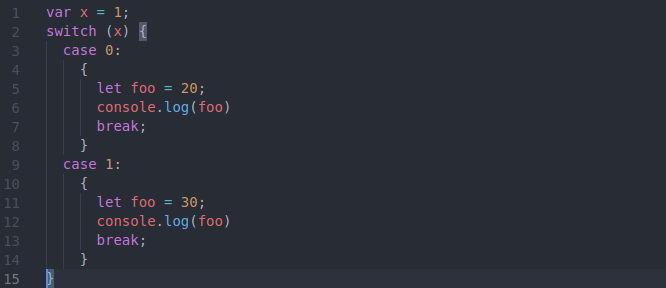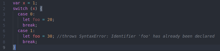 Đặc biệt chú ý không sử dụng let hoặc const khai báo cũng một biến trong các case khác nhau khi sử dụng switch: