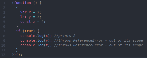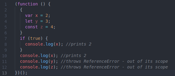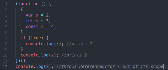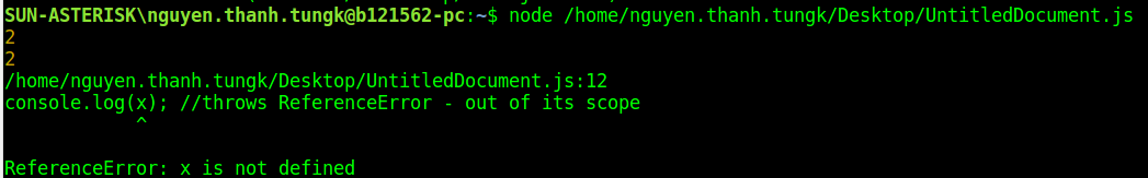 - Lỗi ở dòng 12 do tham chiếu tới biến x ở ngoài scope của nó.