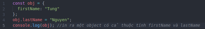 - Một điểm nữa cần lưu ý về const đó là dù cho giá trị của chúng không thể bị gán lại nhưng nó vẫn có thể thay đổi được. Trường hợp này có thể thấy trong thực tế khi giá trị của const là một object, vì thuộc tính của object thì có thể sửa đổi được: