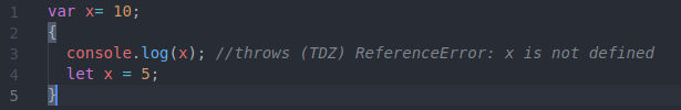 Tuy nhiên, biến được khai báo bằng keyword let hoặc const khi hoisting ta sẽ thấy chúng không được khởi tạo với giá trị undefined. Thay vào đó, chúng ở trong một trạng thái gọi là Temporal Dead Zone, trạng thái này kéo dài từ khi vào scope cho đến khi khai báo xong, trong khoảng này chúng sẽ không thể truy xuất/tham chiếu tới được. Trạng thái TDZ kết thúc sau khi việc khai báo kết thúc.