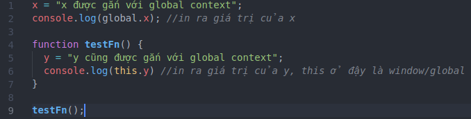 - Khi bạn không khai báo biến mà gán giá trị cho biến, biến sẽ được tạo ra và gắn với global context (window với trình duyệt và global với node). Tuy nhiên điều này là vô cùng không nên vì nó khiến cho việc debug trở nên rất khó khăn.