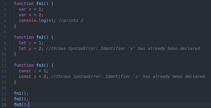 - Các biến được khai báo với keyword var có thể được khai báo lại tại bất kì vị trí nào trong code, kể cả trong cùng một context. Các biến được định nghĩa bằng let và const thì không như vậy, chúng chỉ có thể được khai báo một lần trong scope của chúng.