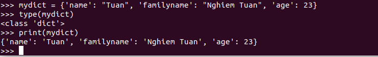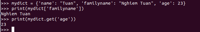 mydict = {'name': "Tuan", 'familyname': "Nghiem Tuan", 'age': 23}