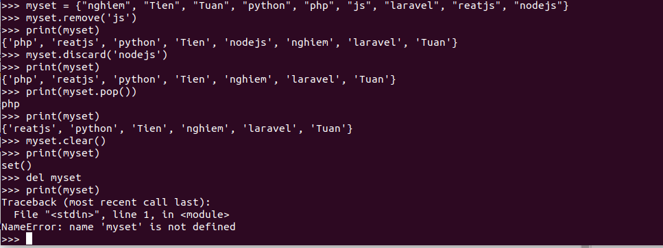 Có thể loại bỏ phần tử trong set, một lần nữa chúng ta không thể thay đổi các phần tử có trong Set vì không có thứ tự. Nhưng chúng ta có thể sử dụng các hàm sau đây để xóa phần tử khỏi Set(): remove, discard, pop - xóa phần tử cuối cùng, clear - xóa các phần tử tròn Set để lại Set rỗng, del xóa luôn Set khi gọi biến này sẽ bị lỗi undefine.